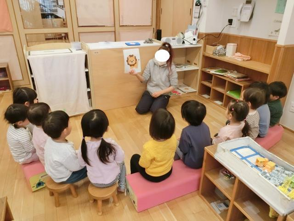 乳児クラスは『とんとん だあれ?』のペープサートを見ました。 扉の中に隠れている動物を予想し「きりん!」「ライオン!」と答えていました。 乳児クラスでも『ドコノコノキノコ』を声をあげて笑いながら踊っていました♪ 「もう1回!」とリクエストするほど楽しんでいましたよ。 |