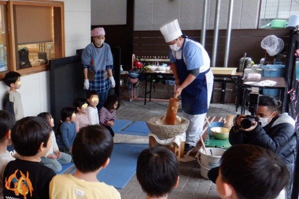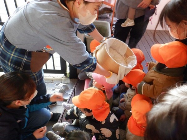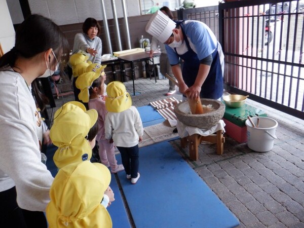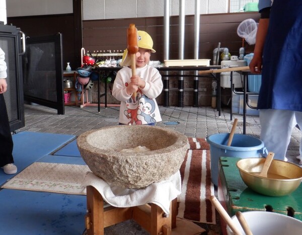 2025年12月26日(金)もちつき会 もちつき会がありました。 事前にゆりぐみさんが洗って水に浸けてくれていた、もち米を蒸してみんなで“ぺったん”とついてお餅を作りました。 つく前の蒸しあがったもち米を子どもたちに見せると、湯気と共にふわ〜っと広がるにおいに「いいにおいがする〜」と興味津々。 もち米を臼に移し、まずは調理さんがおもちをつく様子を見せてくれました。 「うわ〜重そう(杵)」「ぺったん、ぺったん!」など声をあげながら見守っていました。