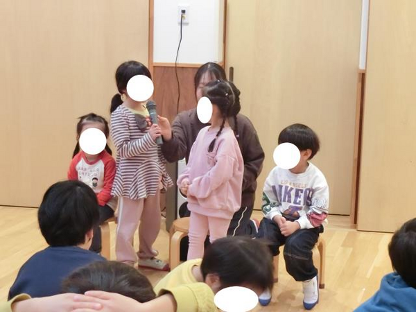 11月18日(火) 11月の誕生会をしました。 司会のゆり組の子どもが誕生児への質問も考えて、インタビューしました! 誕生児へのインタビュー、質問コーナーを終えてみんなで『ハッピーバースデー』を歌いました♪